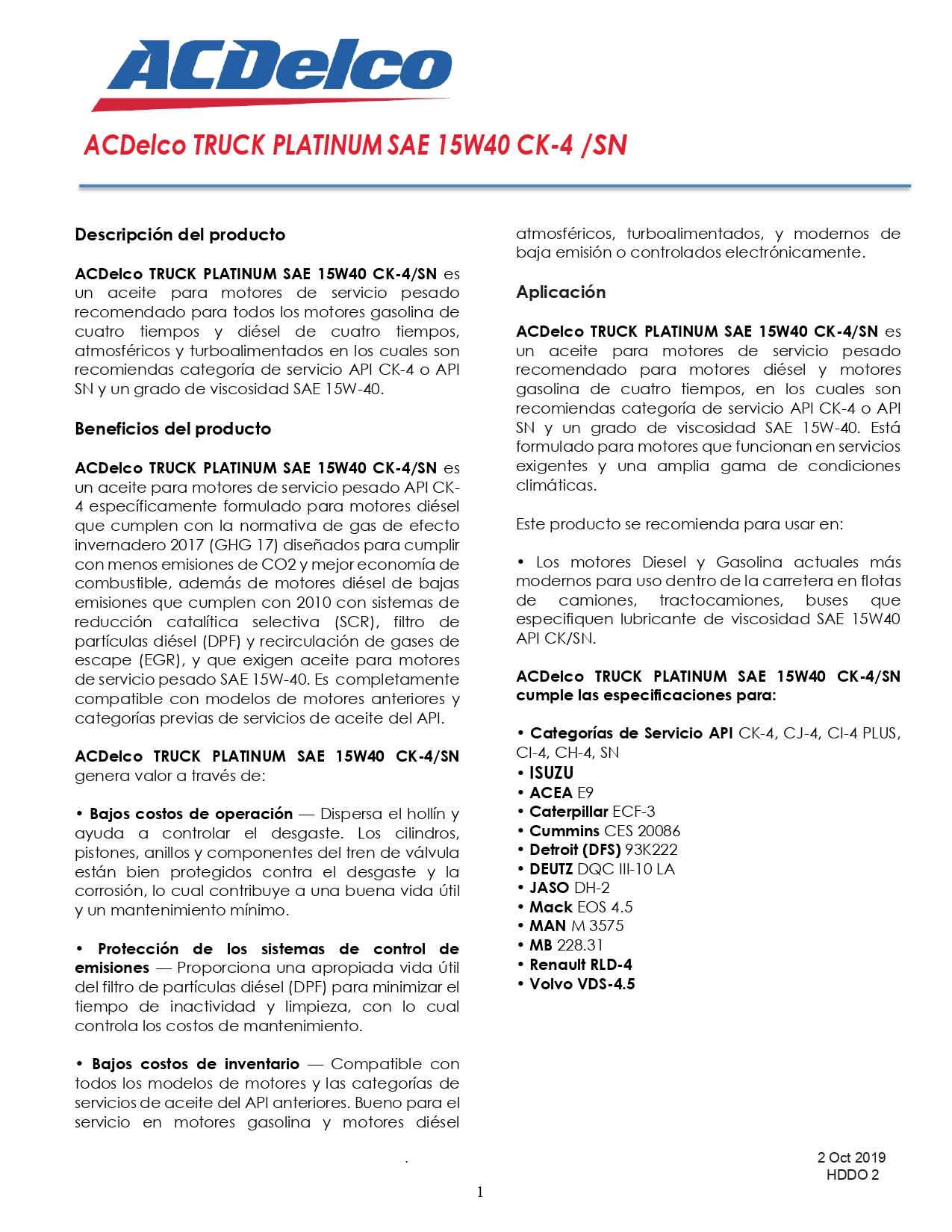 Certificaciones: El aceite ACDelco 15W40 Platinum cumple con las especificaciones para las categorías de servicio API CK-4, CJ-4, CI-4 PLUS, CI-4, CH-4 y SN. También cumple con las especificaciones de varias marcas de vehículos y motores, incluyendo ISUZU, ACEA E9, Caterpillar ECF-3, Cummins CES 20086, Detroit (DFS) 93K222, DEUTZ DQC III-10 LA, JASO DH-2, Mack EOS 4.5, MAN M 3575, MB 228.31, Renault RLD-4, y Volvo VDS-4.5.