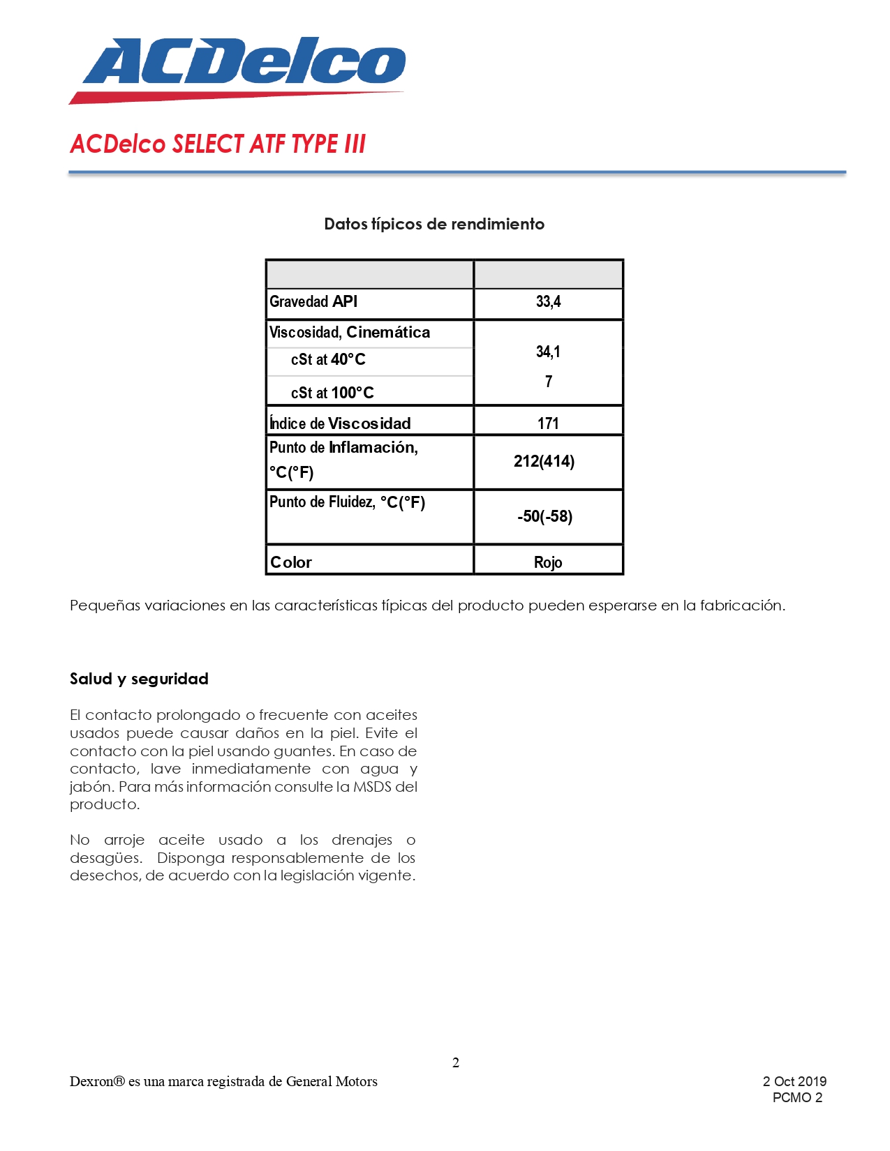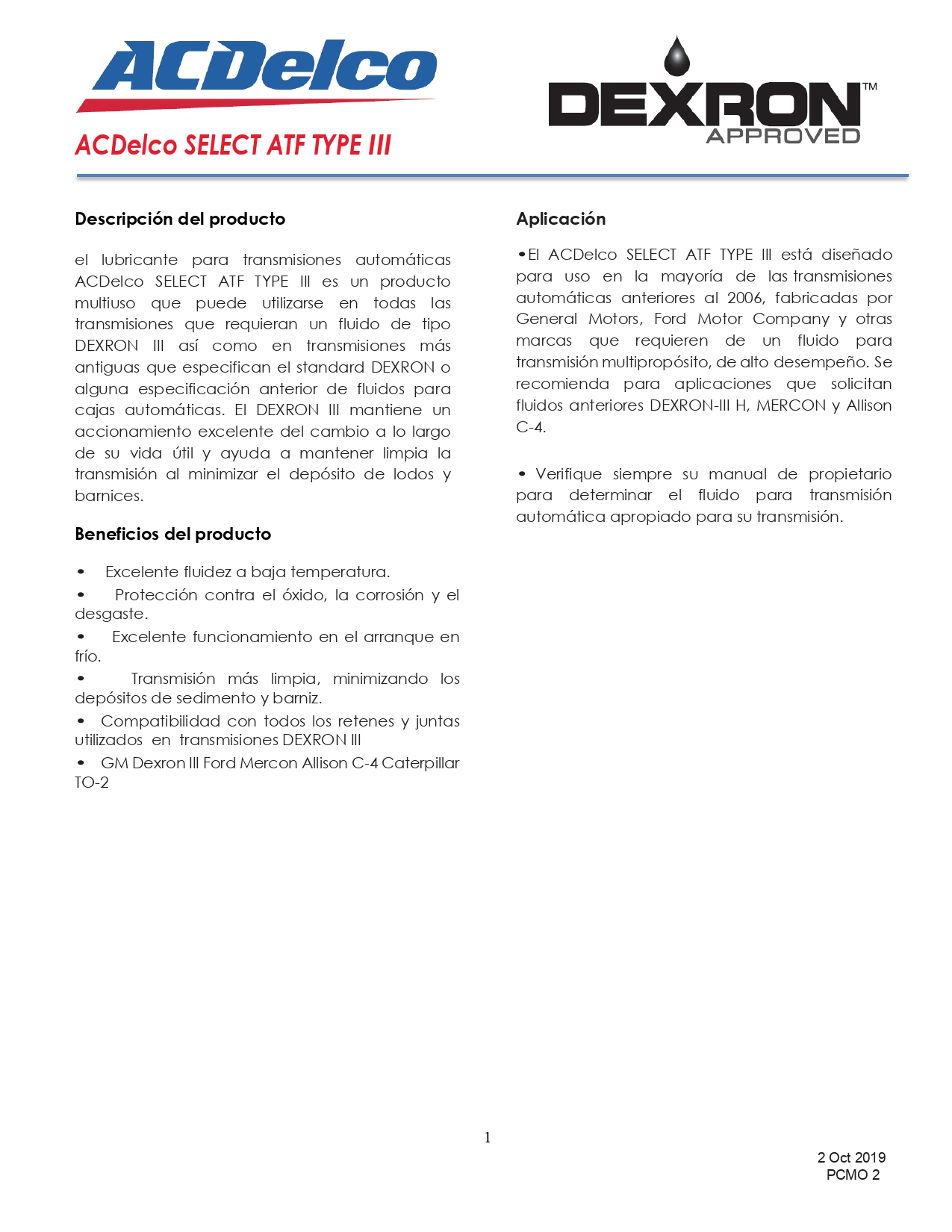 El ACDelco SELECT ATF TYPE III es un fluido de transmisión automática multipropósito, formulado para brindar cambios suaves, protección duradera y limpieza interna en transmisiones automáticas fabricadas antes de 2006.